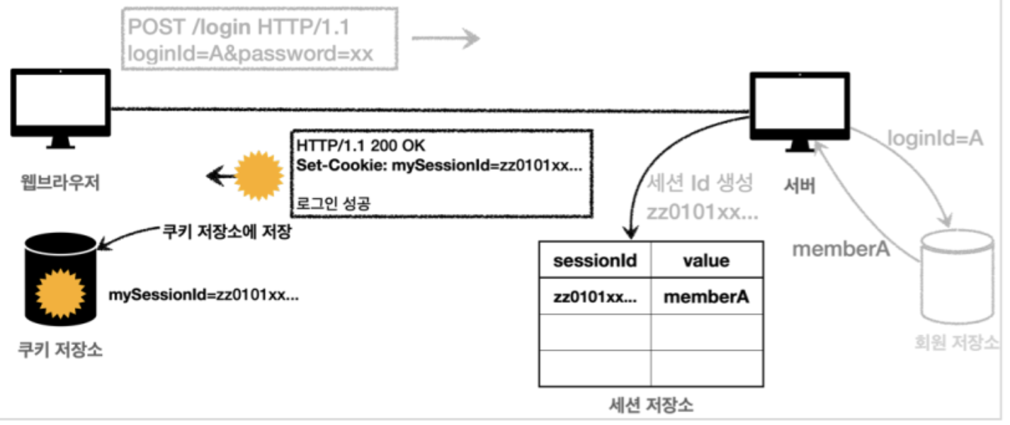 4. 클라이언트는 재접속 시, 이 쿠키를 이용해 sessionId값을 서버에 전달하면 서버에서는 세션저장소에서 해당 sessionId값의 value를 찾아 유저 정보를 찾을 수 있고 없을 시에는 인증되지 않은 유저라고 판단한다.
